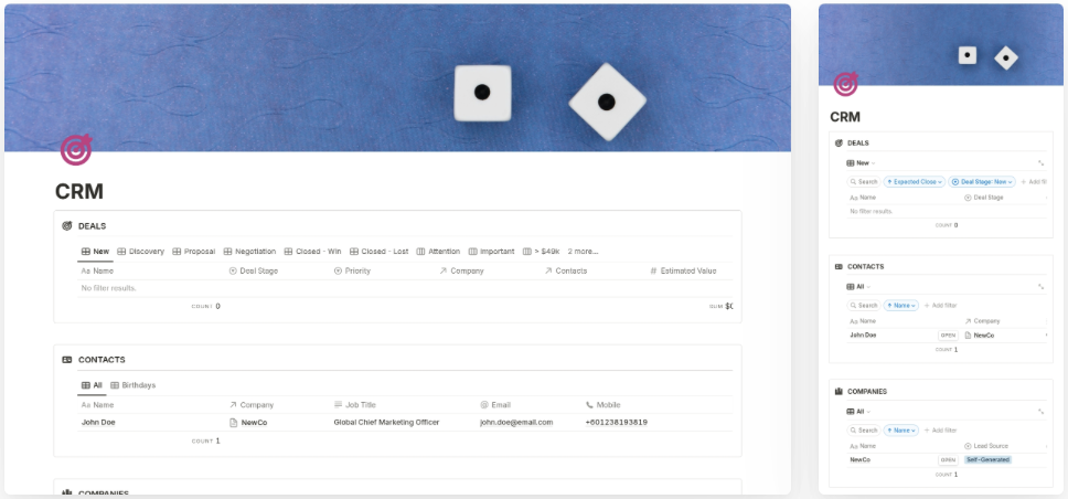 Ideal for building better relationships with your customers by understanding them through a lifetime of interaction tracking across all opportunities. Once an opportunity's activity decreases, this template automatically brings it to your attention. All high-value opportunities are specially grouped so they are always kept in view. All views are carefully designed for uncluttered desktop, tablet, and mobile displays.