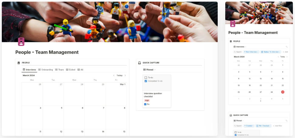 Ideal for tracking recruitment, interview schedules, onboarding process, performance reviews, exit process, and managing employee/team information. Includes checklists for onboarding new team members and exiting employees. All views are carefully designed for uncluttered desktop, tablet, and mobile displays.